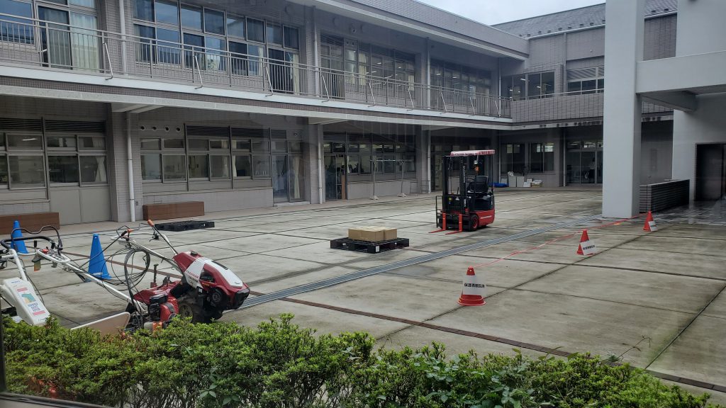 中庭ブースでは、生徒たちが授業で学んでいる流通・農業機械操縦会を見学しました。
