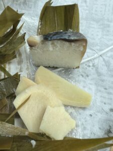 なんとも言えないその匂い、夏季期間は販売してない理由が発酵が促進し⚫︎×▲の匂いとなるからだそう。生姜の甘酢漬けをかじりながら食べるのです。強烈な臭いをリセットしてくれます。