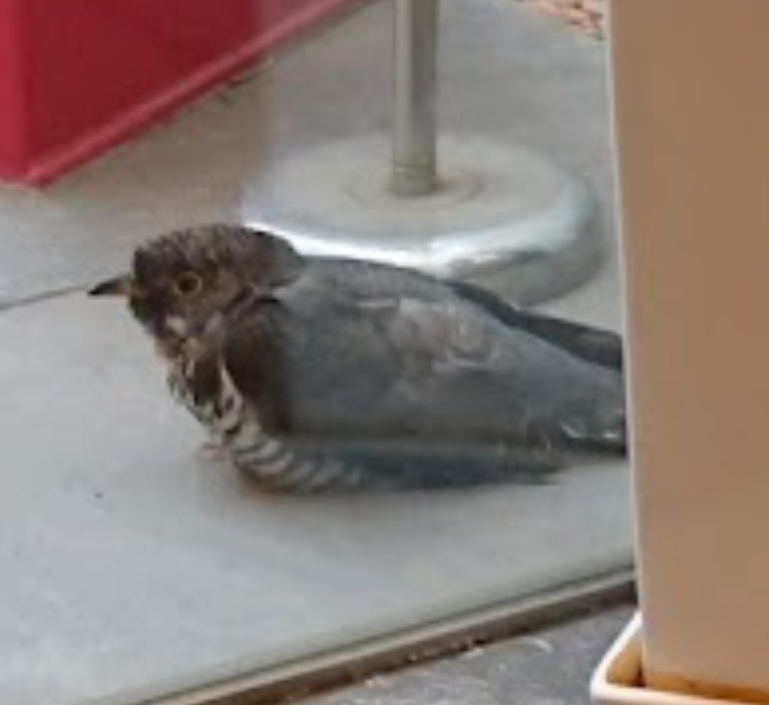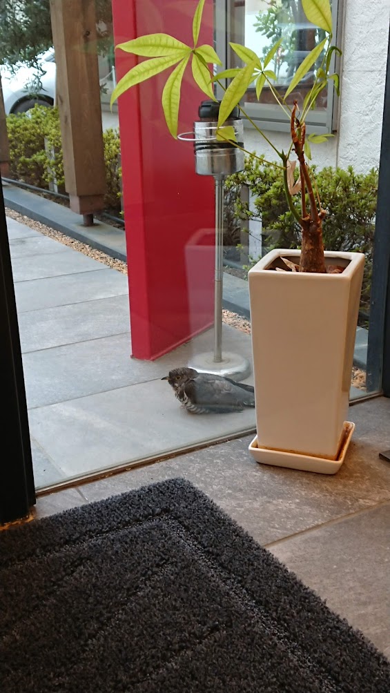 物が落ちたような形跡はどこにもなく、玄関にホトトギスがいました。