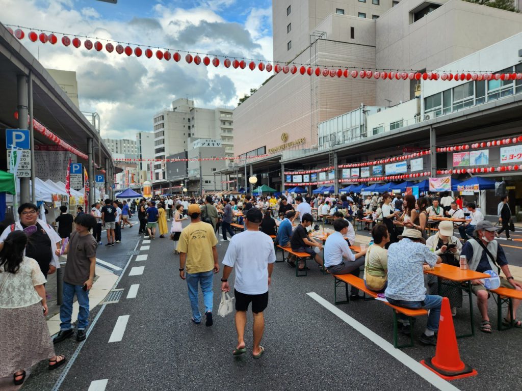 郡山の駅前通りを規制し歩行者天国へ、屋台がたくさん賑っており、