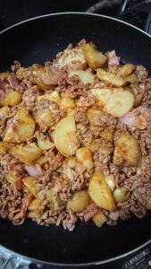 新開さんから頂いたジャガイモで料理。うーん茶色。料理の素を買ってきて具材を切って混ぜる程度の料理でしたが、とてもおいしかったです。新開さん、ありがとうございます。